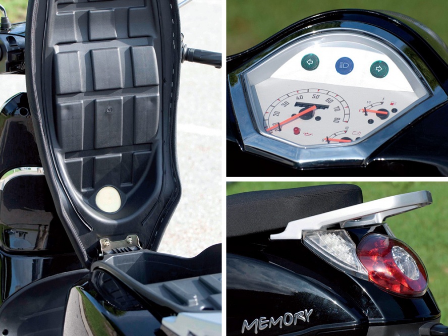 Da gibt es doch den Memory. Der fällt alleine schon wegen seines einprägsamen Namens auf. Aber auch optisch setzt der unter dem Markennamen Beeline von der österreichischen Firma Leeb vertriebene Memory 50 eine erinnerungswürdige Duftmarke. Landläufig würde man das als Vespa-Style bezeichnen, was der Retro-Scoot zur Schaustellt: runder Halogenscheinwerfer in der Lenkerverkleidung, voluminöser Kotflügel vorne, breites Heck mit dicken Seitenbacken hinten, flache Fußablage und reichlich verchromte Zierleisten mit klassisch runden Chromspiegeln. Der Look wirkt aber keineswegs aufgesetzt, sondern besitzt wegen der markanten Front mit den integrierten LED-Blinkern ausreichend Eigenständigkeit.