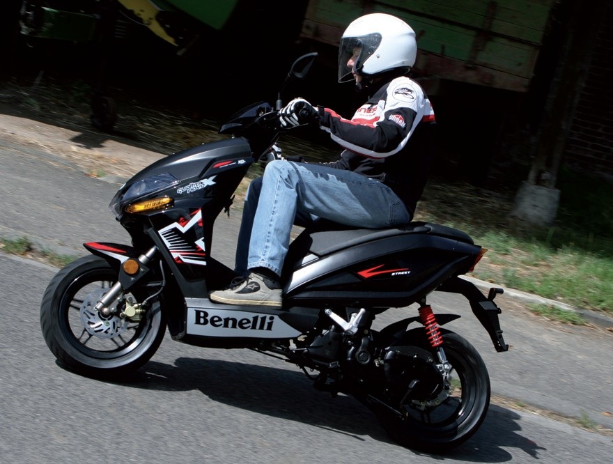 Mit einer Länge von 1,8 Metern ist der chinesische Italiener kompakt geraten. Trotzdem hat der Fahrer ausreichend Platz, seine Extremitäten rechts und links vom Mitteltunnel unter zu bringen. Auch die Knie kommen in Kurven nicht in Konflikt mit dem Lenker. Die aktive Sitzposition garantiert direkten Einfluss aufs Fahrverhalten. Dabei macht der 49er einen fast überhandlichen Eindruck und kippt wie von selbst in die Kurve, verliert dabei aber leicht die vorgegebene Spur, so dass der Fahrer korrigieren muss. Ansonsten hält der Sportler gut seine vorgegebene Bahn und verzeiht auch die eine oder andere Unebenheit in der Fahrbahn. Für einen Fuffi dieser Art ist der Benelli sogar komfortabel abgestimmt. Ordentlich funktionieren zudem die beiden Wave-Scheibenbremsen, nur der Druckpunkt fällt etwas diffus aus.