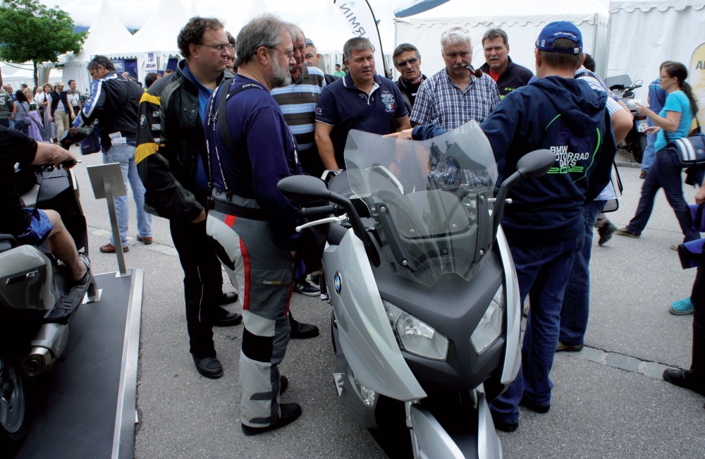 Gerade weil der offizielle Verkaufsstart erst für den 21. Juli angesetzt war, interessierten sich viele der 35000 Besucher für die beiden neuartigen Automatik-Zweiräder im BMW-Modellprogramm. Selbst eingefleischte GS-Fahrer ließen sich von den Service-Kräften die ausgestellten Roller bis ins Detail erklären. Fast schon ehrfürchtig nahmen sie zur Kenntnis, was die beiden Roller so alles können, was das eigene Bike nicht bieten kann. Vor allem die automatische Feststellbremse im Seitenständer fand Interesse. Auch die Lösung zur Erweiterung des Stauraums beim C 600 Sport bereitete staunende Gesichter. Die Möglichkeit zur Sitzprobe wurde weidlich genutzt und fast immer sah man in anerkennende Gesichter. Viele kamen nämlich zum ersten Mal in Kontakt mit einem Maxi-Scooter und waren dann doch überrascht von Ergonomie und Platzangebot.