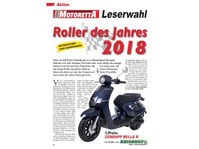 In der aktuellen Ausgabe der Motoretta 6/2018 rufen wir alle Leser auf, an der Wahl zum „Roller des Jahres 2018” teilzunehmen, die wir zusammen mit Reifenspezialist Heidenau durchführen. Unter allen Teilnehmern verlosen wir wertvolle Sachpreise, darunter einen nagelneuen Roller, die wiederbelebte Zündapp Bella R. Es lohnt sich also, die Stimme abzugeben. Fünf Kategorien stehen zur […]