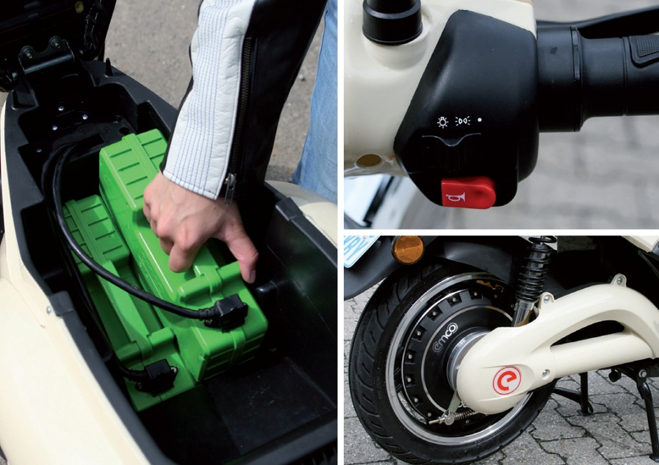 Kein Zweiradsegment ist in solcher Bewegung wie das der E-Scooter. Kontinuierliche Weiterentwicklungen, Verbesserungen und Neueinführungen sind daher die Regel. Von allem ein bißchen findet sich beim überarbeiteten Novi von Emco, der sich mit klassischen Stilelementen an die Traditionalisten unter den modernen E-Rollerfreunden wendet. Die Neuheit beim Novi ist jedoch nicht von außen erkennbar, dazu bedarf es einer über das separate Schloss am Heck geöffneten Sitzbank: Im bekannten Batterieschacht befinden sich nämlich zwei baugleiche Akkus nebeneinander. Die grünen, wie Benzinkanister anmutenden Batterien wiegen jeweils zehn Kilo und lassen sich nach Abnahme des Steckers ohne weitere Arbeiten herausnehmen – beispielsweise zur Ladung an einer herkömmlichen Haushaltssteckdose. Das ist besonders praktisch für Menschen ohne Garage oder geeigneten Abstellraum. Doch auch eingebaut können die Stromspeicher über die Bordsteckdose mit Saft versorgt werden. Serienmäßig ist übrigens nur eine Batterie – jede weitere kostet 750 Euro.