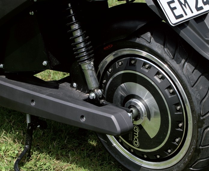 Darunter allerdings steckt ein deutlich potenterer E-Motor mit 5000 Watt und ein leistungsstarker 60-Ah-Lithium-Ionen-Akku, die Betriebsspannung liegt mit 60 Volt über den für Fuffis üblichen 48 V und macht das Potenzial erst nutzbar. Ein stärkerer Rahmen rundet das Ambiente ab. So beschleunigt der 77er auf den ersten Metern sehr vehement, wer dann ob des heftigen Vortriebs den Gasgriff wieder schließt, provoziert einen kräftigen Ruck im Fahrwerk. Feinfühliges Dosieren des Schubs ist nur mit etwas Übung möglich. Auch beim erneuten Gasgeben aus dem Schiebebetrieb setzt es einen ordentlichen Lastwechselschlag. Dafür belohnt der Emco mit formi dablem Durchzugsvermögen, selbst an Steigungen und in beladenem Zustand hält der Novum sein Geschwindigkeitsniveau.