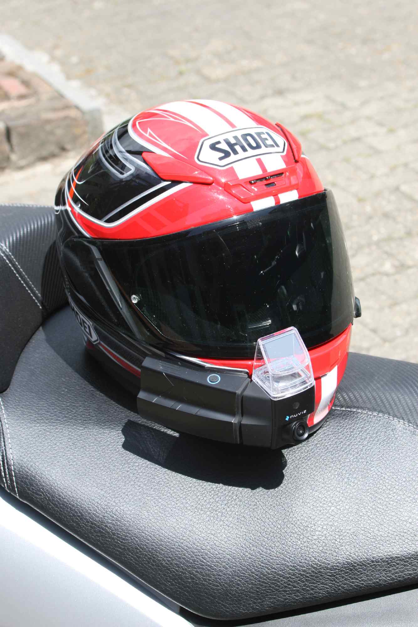 tionen von Navigation, Interkom, Foto- und Videokamera sowie Telefon. Das System besteht aus einem am Kinn des Helms zu befestigenden Gerät mit transparentem Prisma im unteren rechten Blickfeld, wo es die Sicht auf die Straße nicht stört. Im System integriert sind ein GPS-Sensor, eine Kamera und die Software fürs Navi, dazu gehören Kopfhörer für den Helmeinbau zum Lieferumfang.
