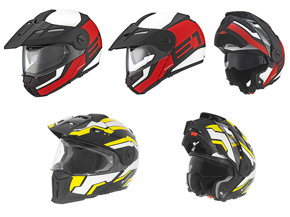 Die Entwicklung im Windkanal soll für einen geringen Luftwiderstand mit nur wenig Fahrgeräuschen im Helm sorgen. Der große Schirm lässt sich in drei verschiedenen Positionen fixieren, gleichzeitig kann das Visier unabhängig vom Schirm bewegt werden. Der E1 kann mit Visier und Schirm, nur mit Visier oder nur mit Schirm getragen werden – im letzteren Fall wird zu einer Schutzbrille geraten.