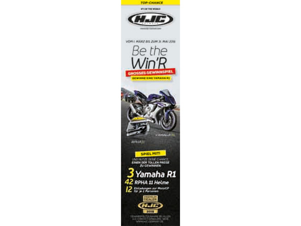 „Be The Win’R” heißt es beim großen HJC-Gewinnspiel, das der südkoreanische Helmhersteller noch bis zum 31.Mai 2016 bei seinen Contact-Händlern durchführt. Den Teilnehmern winken zahlreiche attraktive Preise, wenn sie die richtige Antwort auf die Gewinnspielfrage wissen, die auf der Teilnahmekarte steht. Diese gibt es nur beim HJC-Contact-Händler vor Ort. Wo sich der nächste HJC-Händler befindet, erfährt man online über die HJC-Homepage www.hjc-europe.com.