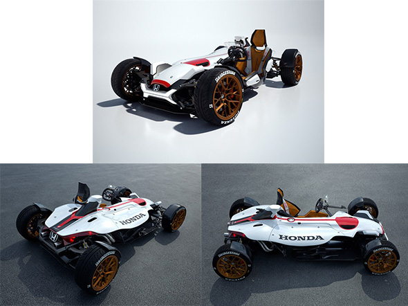 Das Team ließ sich von den Rennsportgenen der Marke inspirieren und orientierte sich bei Karosseriedesign und Motoranordnung an dem legendären Honda RA272 von 1965. Die Konstruktion zeigt den Hauptrahmen und die Funktionsteile des Fahrzeugs auf und erinnert in ihrer Kompaktheit eher an ein Motorrad – bei 3.040 mm Länge, einer Breite von 1.820 mm und einer Höhe von 995 mm wiegt das Modell nur 405 kg. Dadurch kommt die Leistung des Mittelmotors perfekt zur Geltung, der aus der Rennmaschine RC213V stammt und ursprünglich für die MotoGP-Rennserie entwickelt und nun speziell auf den Einsatz auf öffentlichen Straßen abgestimmt wurde. Der V4-Viertakt-Motor mit 999 ccm Hubraum liefert einer Spitzenleistung von mehr als 215 PS bei 13.000/min und ein maximales Drehmoment von mehr als 118 Nm bei 10.500/min, die durch ein 6-Gang-Doppelkupplungsgetriebe (DCT) an die Hinterräder transferiert werden.