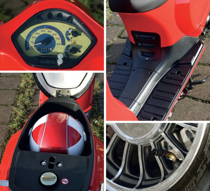 Die Cockpitanzeige ist recht simpel gestaltet, unter die Sitzbank passt ein Jethelm – was nicht auf alle Vespen zutrifft. Praktisch sind das flache Trittbrett sowie das Luft-Ventil
