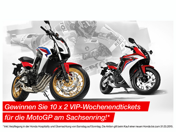 Honda-Käufer haben die Chance, das MotoGP-Rennen auf dem Sachsenring live erleben und den zweifachen MotoGP-Weltmeister Marc Marquez auf seiner Honda in Aktion sehen zu können. Wer bis zum 31. März 2015 eine neue Honda kauft beziehungsweise einen Kaufvertrag für ein neues Honda Motorrad abschließt, nimmt automatisch teil an der Verlosung von 10 x 2 VIP-Wochenendtickets zur MotoGP am Sachsenring (11./12. Juli 2015).
