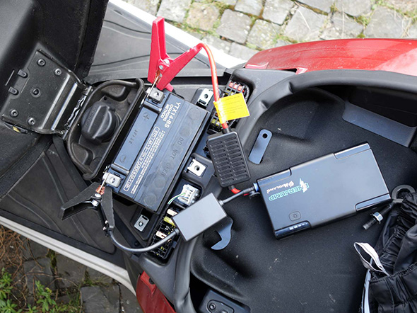 Ein kleiner Tausendsassa zum Laden und Starten von schlappen Akkus und Starterbatterien ist das Starthilfe-Set MIDLAND Enerjump für Motorräder und Autos – auch für unterwegs! Die 300 Gramm leichte, kompakte Powerbank wird über die Steckdose geladen und stellt vollgeladen einen Energiespeicher von 8.000 mAh zur Verfügung. Springt das Bike oder der Roller nach längerer Standdauer in der nasskalten Jahreszeit nicht mehr an, wird die Powerbank über das mitgelieferte Überbrückungskabel direkt an die Batterie angeschlossen, eingeschaltet und das Gefährt im Anschluss gestartet. Der extra Schub aus dem kraftvollen mobilen Akku erreicht dabei eine maximale Stromstärke von 400 A; wir konnten damit tatsächlich unseren Dauertester Peugeot Metropolis zum anspringen bewegen, nachdem die Bordbatterie nicht mehr genug Saft hatte, um den Anlasser durchzudrehen.