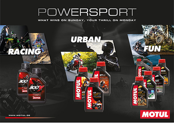 Motul hat sein Powersport-Segment um drei zusätzliche 4-Takt-Scooter-Motorenöle erweitert. „Mit unserem neu geschaffenen Produktsegment Powersport bedienen wir das gesamte Portfolio für den Bedarf aller Powersport-Motoren unserer Kunden in Alltag und Freizeit. Jetzt ist es uns gelungen, unser Angebot nochmals mit weiteren Produkten perfekt zu ergänzen“, sagt Alexander Hornoff, Leiter Technik der MOTUL Deutschland GmbH. Der Produktbereich Powersport umfasst vom Motorrad über Roller, ATV-SxS-UTV, Snowmobile und Jetski bis hin zu Kart und Modellbau sämtliche Fahrzeugarten.