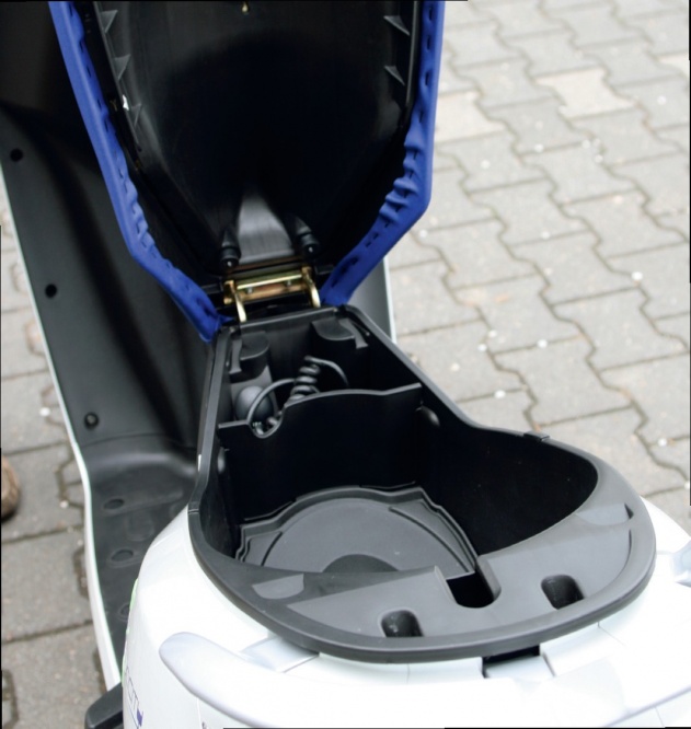 Über den jeweiligen Akku-Ladezustand informiert das hypermodern gestaltete LCD-Instrument im Cockpit mittels zehn Segmenten in drei Farben: Das rote Segment weist auf einen kritischen Ladezustand hin, die orangefarbenen Segmente 2 und 3 geben einen Ladezustand unter 30 Prozent an. Die darüber liegenden Segmente signalisieren einen Ladezustand im grünen Bereich, zusätzlich wird die verbleibende Reichweite recht zuverlässig angezeigt. Doch das Instrument kann noch mehr: Über einen Knopf am unteren Ende wählt der Elektro-Fahrer die gewünschte Betriebsart aus. Ihm stehen die vier Optionen „normal”, „eco”, „forward“ (für langsames Manövrieren) und ein Rückwärtsgang zur Verfügung. Dabei hätte der 114 kg leichte Stromer eigentlich keine Rangierhilfe nötig.