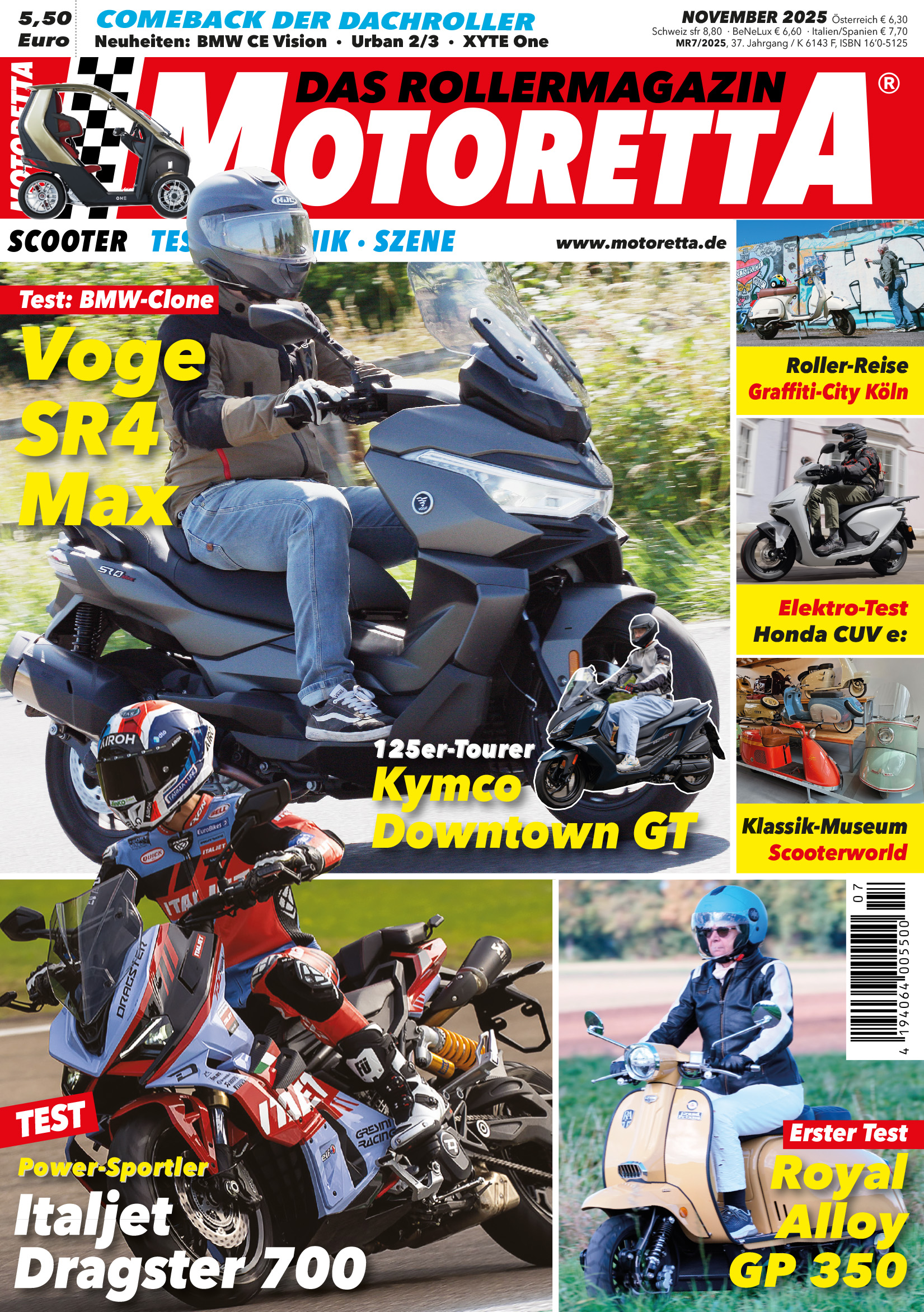 Die neue Motoretta 7/2025 hat es in sich, sie bietet eine außerordentliche Vielfalt an Modellen vom Tourer über den Supersportler bis hin zum brandneuen Klassiker. Mit dem Voge SR4 Max Luxury ging es auf ausgedehnte Test-Tour, der Kymco Downtown GT 125 zeigt, dass man auch mit deutlich weniger PS entspannt unterwegs sein kann. Für den innovativen Highend-Scooter Italjet Dragster 700 ging es für unseren Tester sogar auf die Rennstrecke von Imola, um dem Power-Sportler auf den Zahn zu fühlen. Und für die Fans klassischer Roller konnten wir exklusiv die neue Royal Alloy GP 350 fahren, als attraktiven Gegenpol zu Vespa und Lambretta. Eine Wiederbelebung erfährt das Thema Dachroller: Nicht nur BMW stellt mit dem CE Vision eine Weiterentwicklung ihres legendären C1 vor, auch andere Hersteller zeigen serienreife Modelle, die im kommenden Jahr in den Handel kommen sollen. Für die Elektro-Fraktion stellen wir Hondas ersten für Europa produzierten E-Scooter CUV e: vor, den wir in England in Augenschein genommen haben. Nicht ganz so weit weg, nämlich nach Belgien, ging es für unseren Autor zum Besuch der Sooterworld, eine einzigartige Sammlung historischer und seltener Roller der 1950er- und 60er-Jahre. Als Vorschau auf die Intermot in Köln im Dezember führt unser Reisebericht diesmal durch die Domstadt und zeigt eine bisher weniger bekannte Seite der Metropole am Rhein. Die neue Motoretta 7/2025 gibt es hier als PDF-Download.