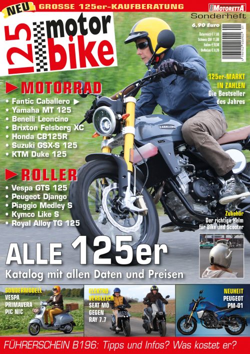 Leichtkrafträder und Roller bis 125 Kubikzentimeter Hubraum sind die Renner im Zweiradhandel. Der neue Führerschein B196, der es Autofahrern erlaubt, ohne zusätzliche Prüfung ein Fahrzeug dieser Klasse fahren zu dürfen, hat seinen Teil dazu beigetragen. Im neuen Motoretta-Sonderheft „ 125 Scooter & Motorbike 2023” gibt die Redaktion eine umfassende Kaufberatung mit einer kompletten Übersicht über alle 125er-Zweiräder in Deutschland mit den wichtigsten Daten und Preisen. Auch elektrisch angetriebene 125er- kommen dabei nicht zu kurz. Neben zahlreichen Roller- und Motorrad-Tests verschiedener Marken von Hightech bis günstig helfen Tipps sowie eine Übersicht der am meisten verkauften 125er bei der Kaufentscheidung. Als Servicethemen erwarten den Leser eine Erklärung der aktuellen Führerscheinregelungen und die Adressen aller Hersteller- und Importeure. „125 Scooter & Motorbike” ist der perfekte Einstieg ins motorisierte Zweiradleben.