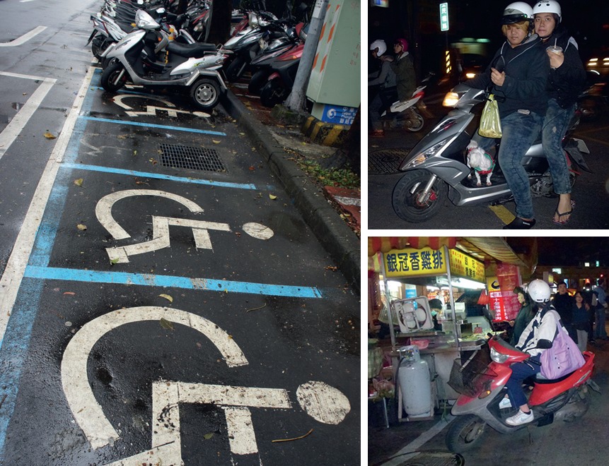 Im Taipei-Tower „101”, mit 508 Metern lange Zeit das höchste Gebäude der Welt, gibt es eine Parkhaus für circa 1000 Pkw. Das ist nichts Besonderes, Besonders sind dagegen die knapp 3000 Parkplätze für Roller. Ja, in Taipei gibt es eigene Tiefgaragen für Scooter, mit mehreren Stockwerken unter der Erde. Aber auch ebenerdig besetzen die Stadtflitzer selbst die kleinste freie Fläche am Straßenrand, vor Geschäften, unter den Einkaufsarkaden und natürlich auf den regulären Roller-Parkplätzen. Eigentlich ist Taipei ein einziger Scooter-Abstellplatz, schließlich müssen die nahezu eine Million Roller, die täglich in Taipei unterwegs sind, irgendwo bleiben. Es gibt sogar Behindertenparkplätze für die zahlreichen dreirädrigen Scooter, die meistens von älteren Menschen gefahren werden. Der Roller ist das wichtigste Verkehrsmittel für alle Bevölkerungsgruppen, jede Erledigung wird mit dem Roller absolviert. Autos sind für die meisten Taiwaner ein Luxus-Artikel, den sie sich nicht leisten können, ein 125er-Roller kostet dagegen etwa 700 bis 800 Euro.
