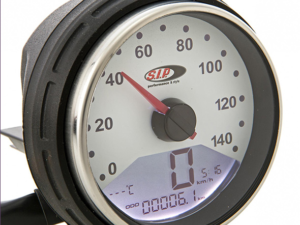 Der Augsburger Klassikrollerspezialist SIP hat sein Angebot an digitalen Tachos für Vespa und Lambretta um Instrumente für Vespa PK50-125/S/SS/Automatica und Lambretta LI 125/150 1°/2°/TV 175 1° erweitert. Beim neuen Drehzahlmesser/Tacho SIP 2.0. orientiert sich das Design stark am Original, die Zusatzfunktionen sind bei ausgeschaltetem Motor nahezu unsichtbar. Schriftart und Position der originalen km/h-Anzeige sind weitgehend identisch, die Einbaumaße ebenfalls. Bei dem 2.0er kann man sich nun für eine analoge Geschwindigkeits- oder Drehzahlanzeige entscheiden. Die Tachonadel zeigt demnach entweder Drehzahl oder Geschwindigkeit an. Zwei Einzelstrecken mit Fahrzeit und Durchschnittsgeschwindigkeit sind möglich, die Gesamtstrecke zudem einstellbar. Zuvor gefahrene Kilometer können übernommen werden, in Verbindung mit dem SIP Fast Flow mit Reserveanzeige blinkt FUEL bei knappem Tankstand auf. Einstellung und Wechsel der Anzeigen erfolgt über einen kleinen Druckknopf, der unauffällig am/unter dem Lichtschalter befestigt werden kann. Die Geschwindigkeitsabnahme erfolgt über die Tachowelle oder einen im Zubehör erhältlichen Speedsensor, die Drehzahlabnahme erfolgt über das Lichtsignal. Alle Daten werden in einem internen Speicher gesichert, der Betriebsstrom kommt vom Bordnetz – eine Batterie ist nicht erforderlich! Auch der Anschluss an Vespatronic/ Parmakit Zündungen ist möglich. Alle Tachos werden mit einem zusätzlichen Spannungsregler, Anschlussmaterial, Temperatursensor und Einbauanleitung ausgeliefert. Für die modernen Anzeigeinstrumente ruft SIP ab 159 Euro auf.