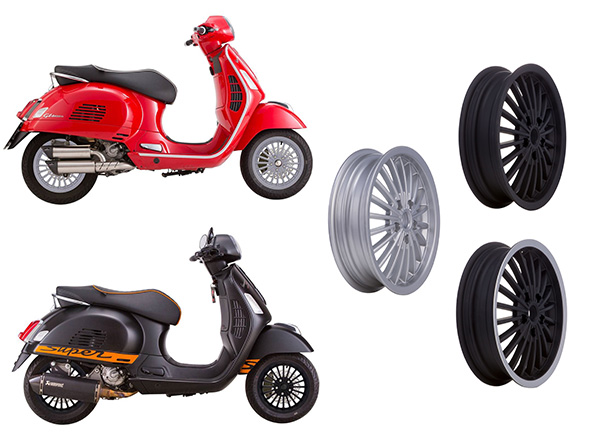 Die Felgen sind unter Berücksichtigung der ETRTO (European Tyre and Rim Technical Organisation) Richtlinien, der Industrievorgabe für Felgen- und Reifenproduktionen, gefertigt und besitzen das KBA Typenzeichen, sind somit straßenzugelassen im deutschen Verkehr einsetzbar. Bei Vespa GTS Modellen mit ABS 2014 muss der ABS Sensor mit einer Unterlegescheibe etwas ausdistanziert werden (geringer Spurversatz). Lieferbar in Mattschwarz, Mattschwarz mit poliertem Rand und Silber zum Preis von 149 Euro.