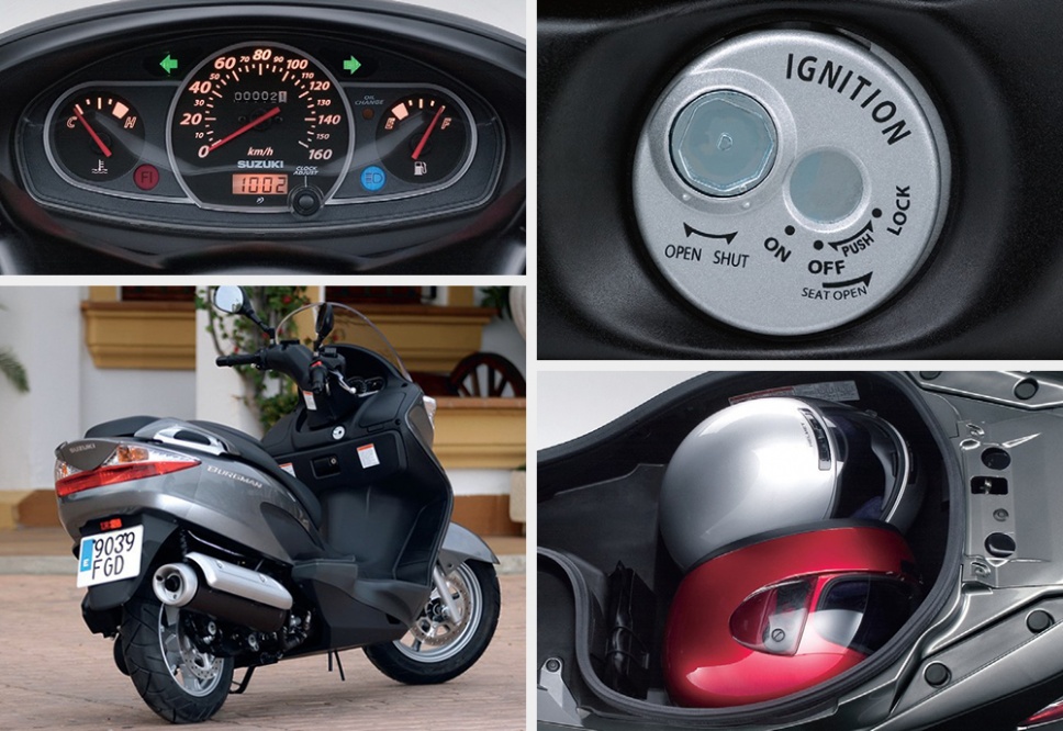 Die Ausstattung lässt auch beim kleinsten Burgman kaum Wünsche offen. Das Cockpit bietet reichlich Infotainment, das Zentralschloss schützt vor Diebstahl, unter der Sitzbank ist reichlich Platz für zwei Helme