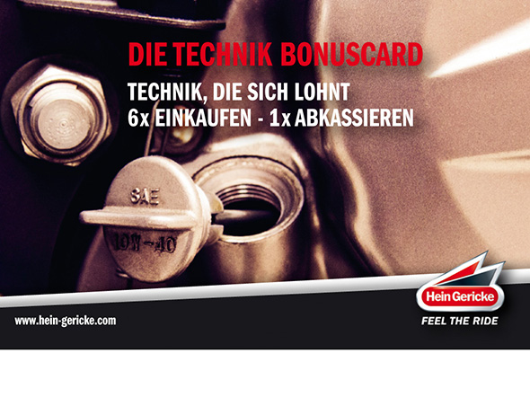 Hein Gericke steht nicht nur für Bekleidung und Zubehör, sondern bietet auch großes Angebot an Ersatz- und Serviceteilen namhafter Markenhersteller. Um dieses Sortiment etwas zu beleben, hat Hein Gericke die Technik Bonuscard ins Leben gerufen. Diese wird beim Einkauf im HG Store vor Ort ausgehändigt und funktioniert wie ein Rabattheft: Bei jedem Technik-Einkauf ab Einkaufswert 10 Euro gibt es einen Stempel. Wer sechs Stempel auf der Karte hat, bekommt 4 Liter Performance Öl 10W-40 sowie einen Performance Ölfilter nach Wahl gratis.