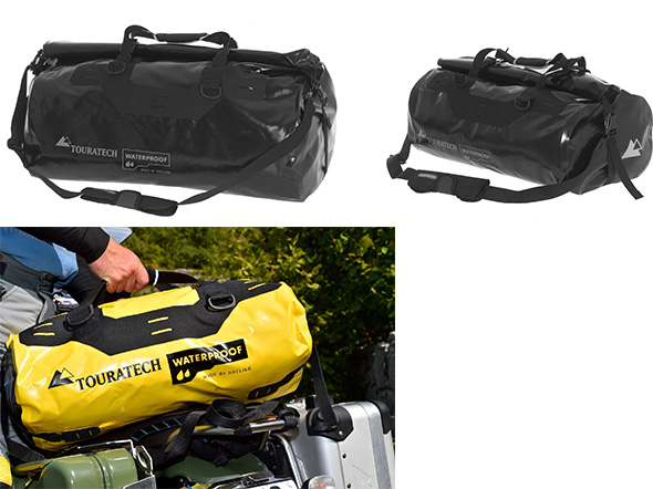 Vom Schwarzwälder Ausrüstungsspezialisten Touratech kommt eine speziell für Gepäckbrücken vorbereitete wasserdichte Gepäckrolle mit Namen Adventure Rack-Pack. Fixierte Spanngurtösen vereinfachen das sichere Verzurren des Rack-Pack auf dem Gepäckträger, zusätzliche Riemendurchführungen ermöglichen das Befestigen von weiterer Ausrüstung mit optionalen Spanngurten. Der breite Rollverschluss sorgt für absolute Wasserdichtheit und gleichzeitig durch die große, quer liegende Öffnung für kinderleichtes Be- und Entladen. Seitliche Kompressionsriemen und Zurrgurte über dem Rollverschluss sorgen für ein variables Packmaß und sicheres Vertäuen auch bei halbvollem Rack Pack.