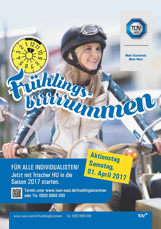 Welches TÜV SÜD Service-Center in der Nähe am Samstag, 1. April 2017, wie lange geöffnet hat, steht unter www.tuev-sued.de/fruehlingsbrummen