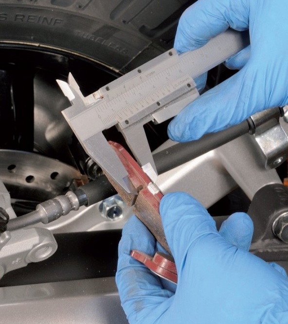 Bremsbelagstärke überprüfen: Mit einer Schieblehre lässt sich die Reststärke des Belags einfach ermitteln. Vor dem Einbau die Bremskolben zurück drücken, danach darauf achten, dass die Bremse zwei-, dreimal betätigt wird, um die Funktionstüchtigkeit wieder herzustellen.
